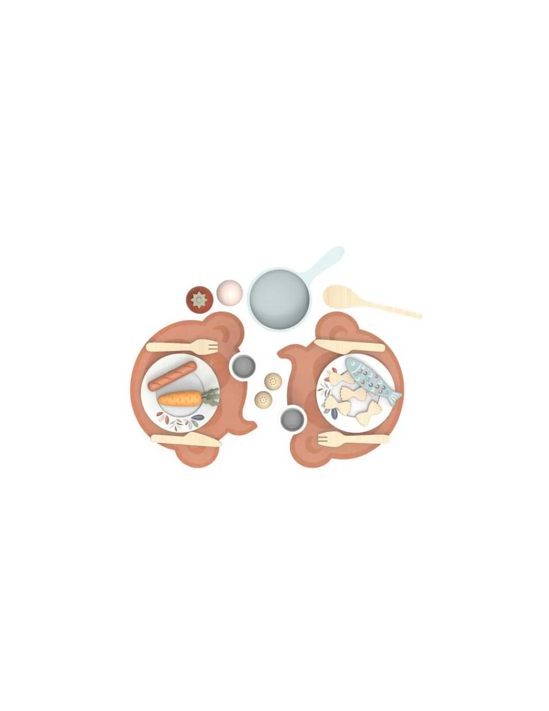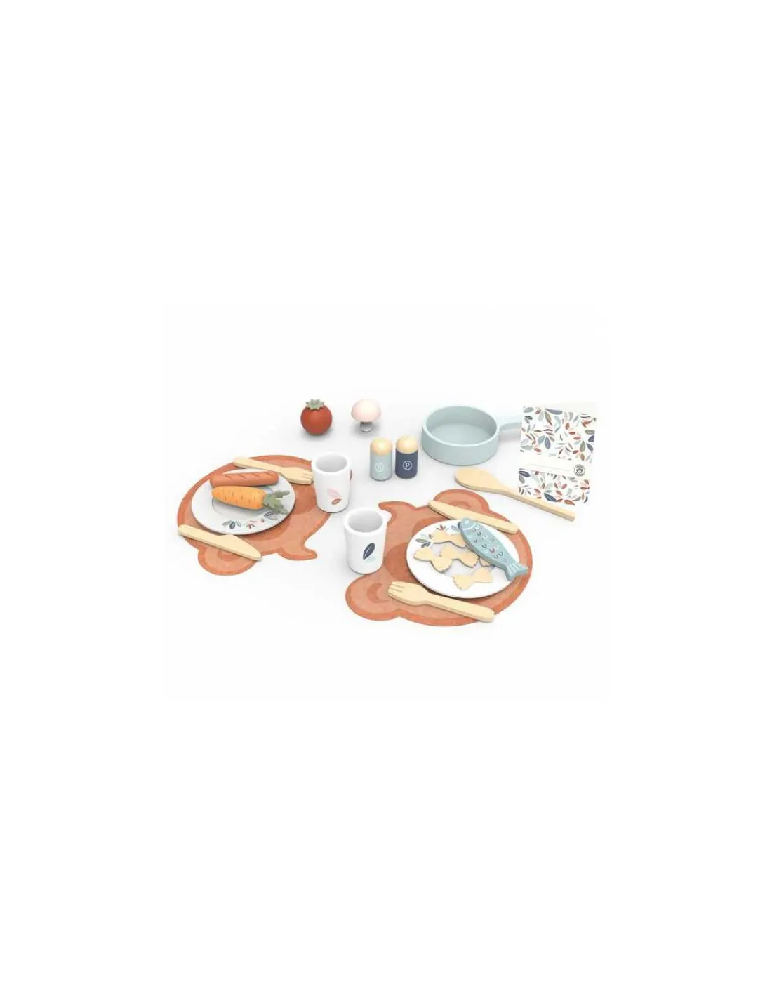 Cet adorable ensemble de dinete en bois pour deux comprend 19 pièces, notamment des pâtes, du poisson, des légumes, du sel, du poivre, des assiettes et des poêles.