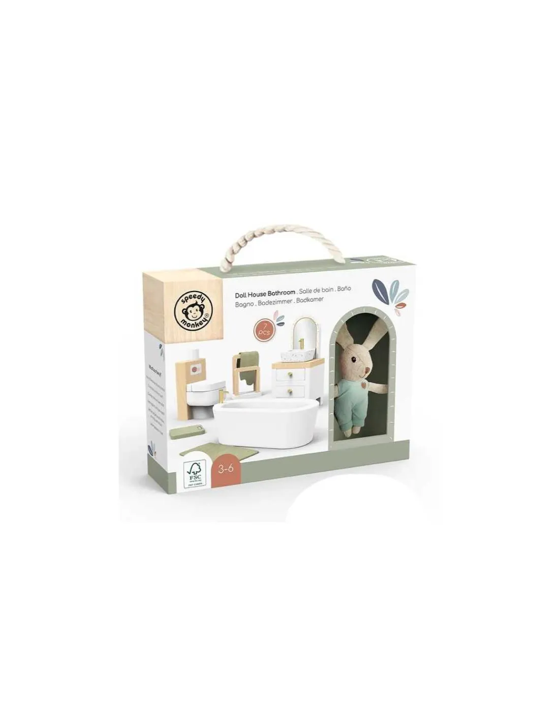 Découvrez la Salle de bain pour maison de poupée de Speedy Monkey, un coffret cadeau comprenant une salle de bain en bois et un personnage lapin en lin qui fera rêver les enfants à partir de 3 ans.