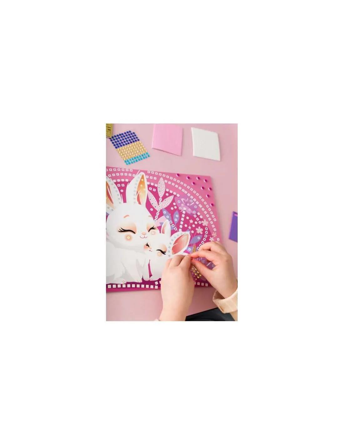 Ce coffret contient 5 tableaux de 24 x 34 cm, +2000 mousses autocollantes et joyaux, 5 supports d’accroche et un guide pas à pas dans une magnifique boite illustrée.
