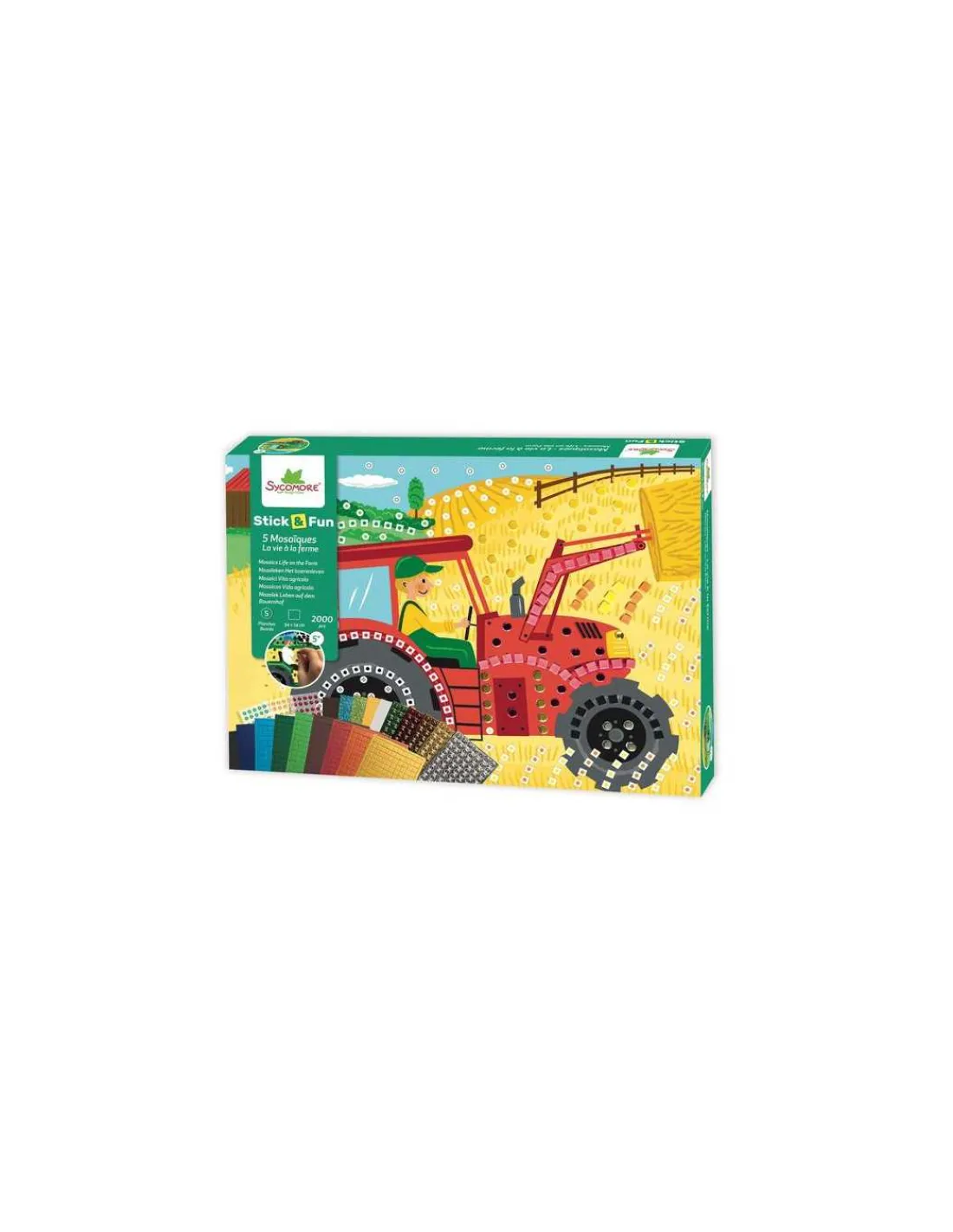 Découvrez le coffret de 5 mosaïques la vie à la ferme de Sycomore, un coffret de loisirs créatifs de la collection Stick & Fun pour les enfants à partir de 5 ans sur le thème de la ferme avec des tracteurs et une moissonneuse.