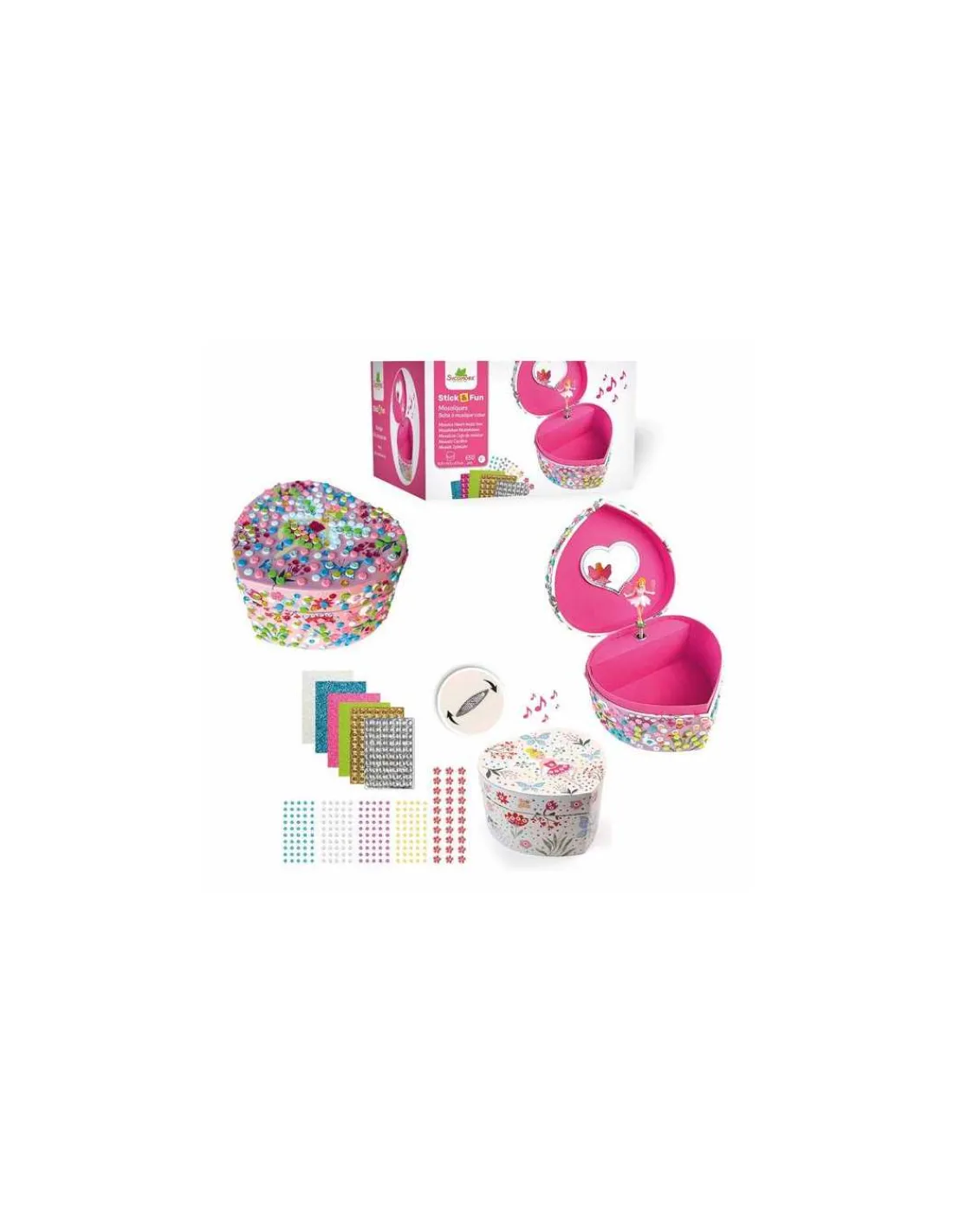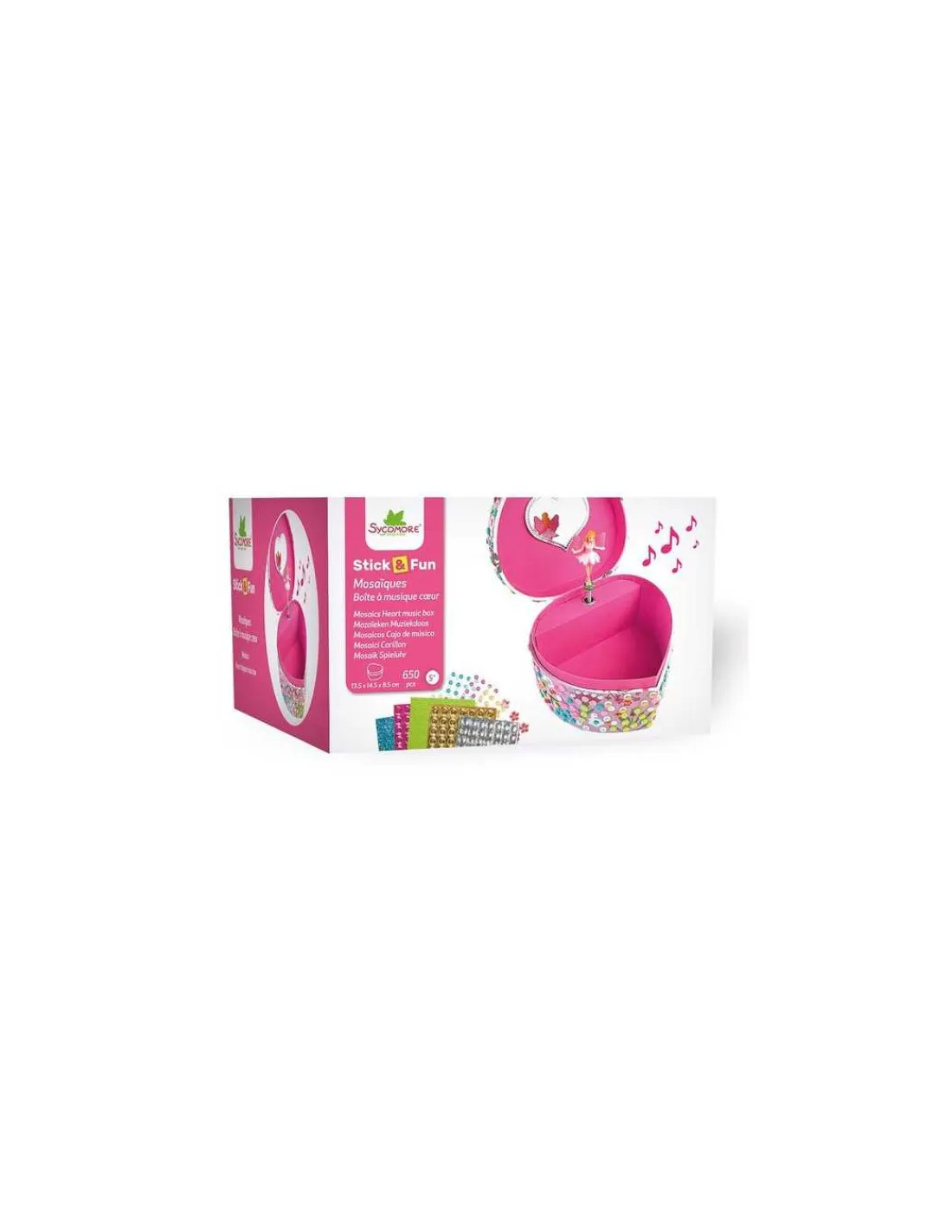 Découvrez le coffret boite à musique coeur 3D mosaïques de Sycomore, une boite à bijoux de la collection Stick & Fun en forme de coeur pour les enfants à partir de 5 ans qu’ils vont pouvoir décorer.
