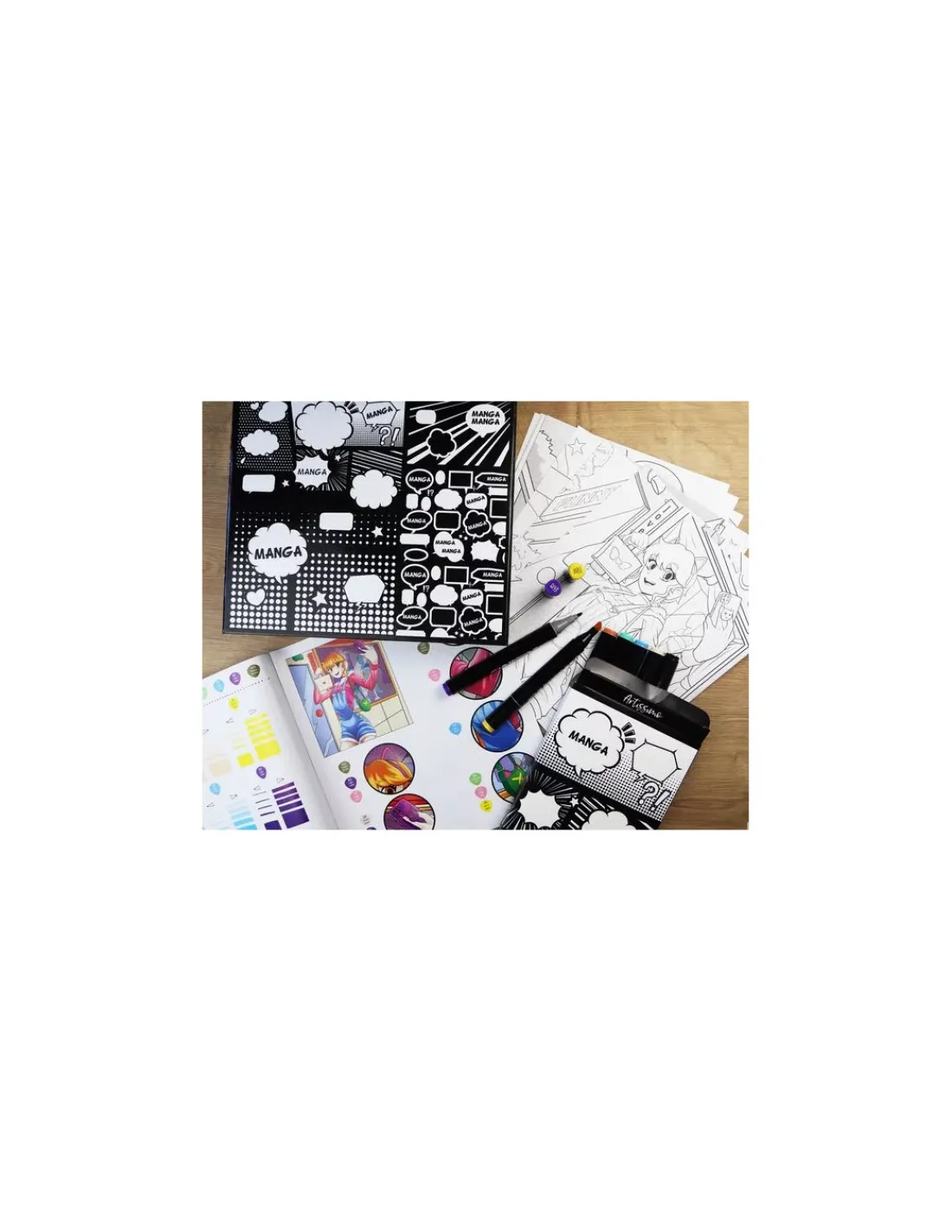 Un coffret sur le thème des mangas qui comprend 8 marqueurs double pointe, 10 feuilles de papier layout, des modèles de manga et un livret pour bien utiliser les marqueurs.