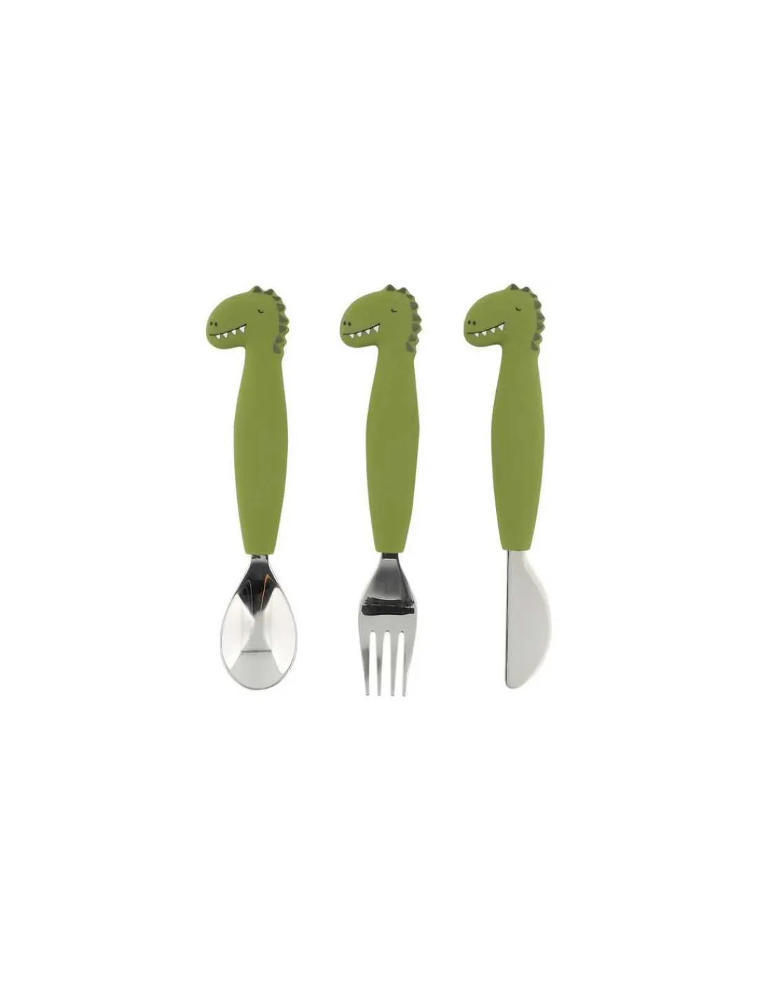 Découvrez les couverts en silicone Dinosaure de Trixie, de la vaisselle pour enfant comprenant une fourchette, une cuillère et un couteau avec la jolie frimousse du dinosaure Trixie.