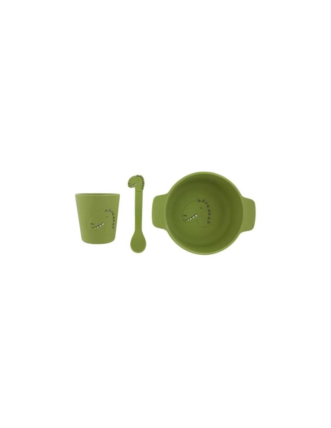 Découvrez le set repas en silicone Dinosaure de Trixie, de la vaisselle pour enfant comprenant un bol, un verre et une cuillère avec la jolie frimousse du dinosaure Trixie.