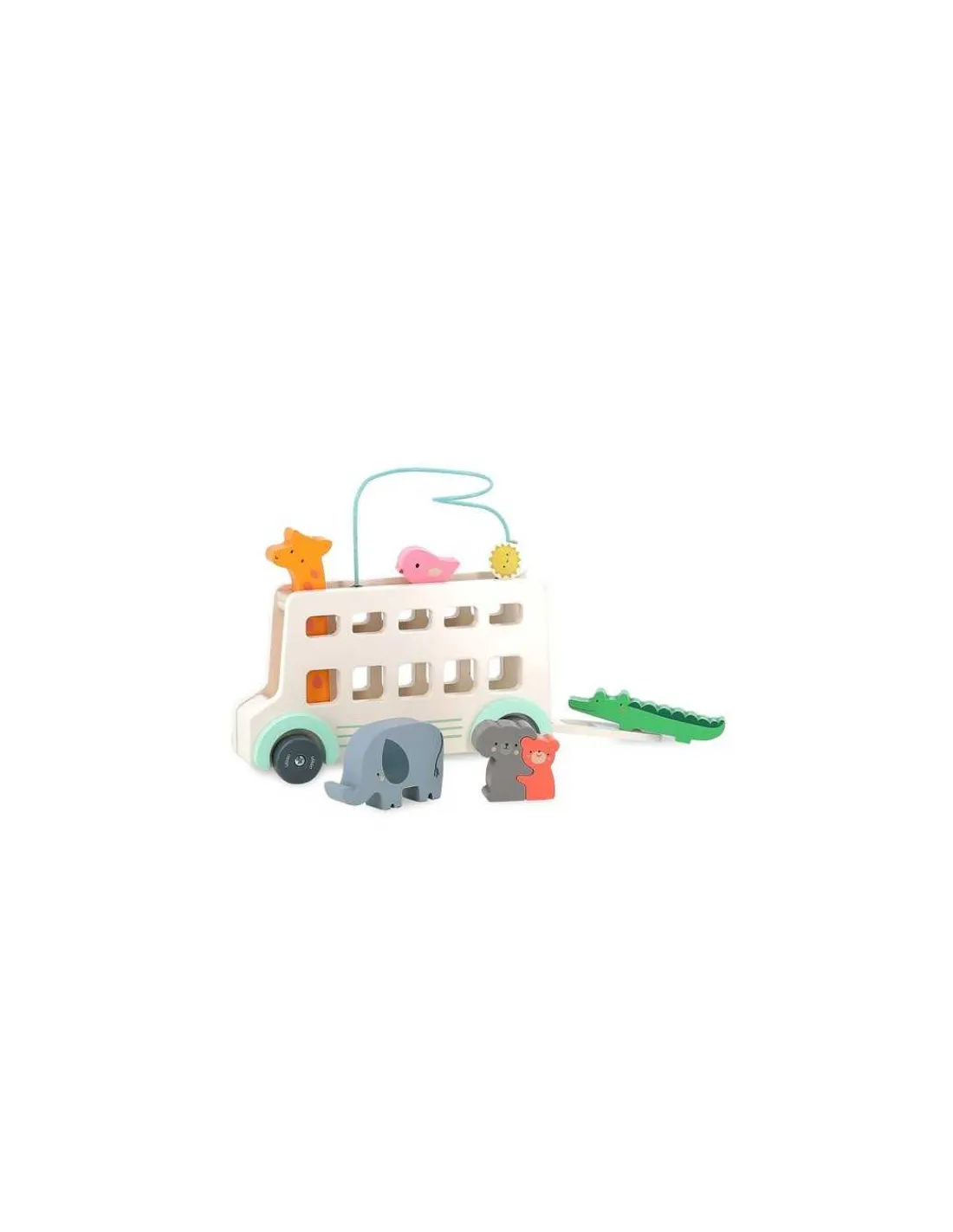 Le jouet comprend un autobus en bois, une girafe klaxon, un soleil le long d’un fil, un oiseau, un éléphant, un koala et un ours.