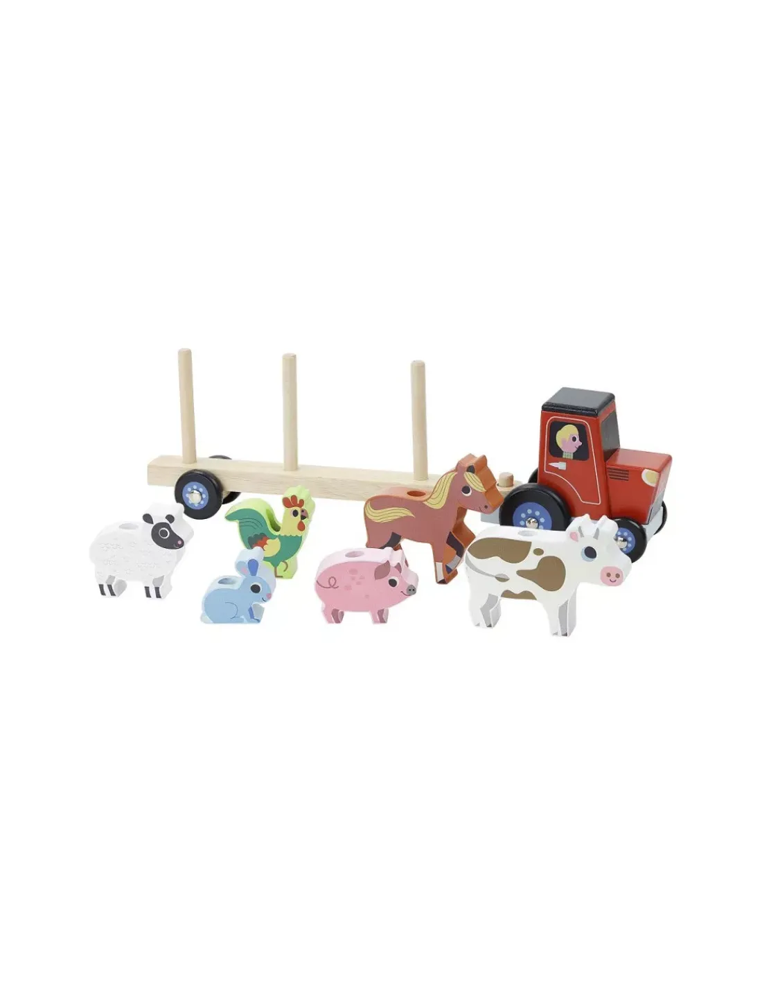Après avoir joué avec ses animaux, c’est tellement rigolo de les ranger les uns sur les autres sur la remorque du tracteur. Mouton, vache, cheval, cochon, lapin et coq trouveront place dans la remorque du tracteur.