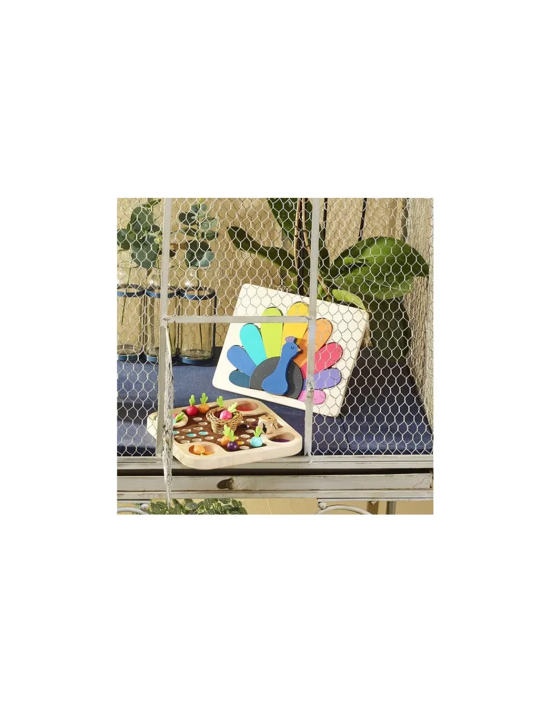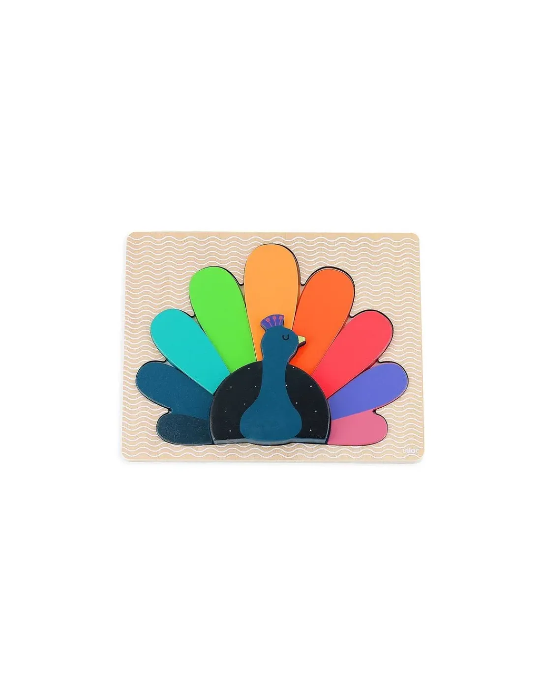 Découvrez le puzzle encastrement en volume paon de Vilac, un magnifique puzzle en bois Montessori dessiné par Andy Westface pour les enfants à partir de 2 ans.